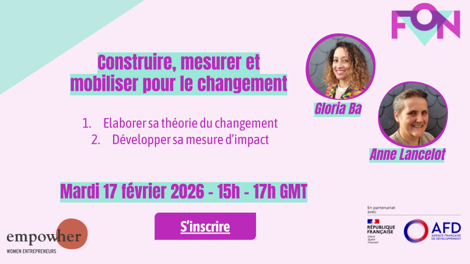 Lors de cette masterclass en visioconférence avec les formatrices Gloria Ba et Anne Lancelot, vous pourrez bénéficier d’ateliers pratiques et interactifs portant sur la théorie du changement et le développement d’une méthodologie de mesure d’impact.